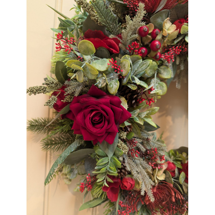 This beautiful red rose Christmas wreath is something very special and is such a show stopper. If you would like to see a video of this please go to my social media sites woldswreathsdecor. It is made from faux foliage and finished off with quality embellishments with stunning red roses and hydrangea flowers, pine cones. This can be treasured for many years to come. Available in two sizes 45cm £79.00 & 60mm £89.00 please state which size in the comment box when pre ordering. All my floral creations are made to order so may be slightly different.