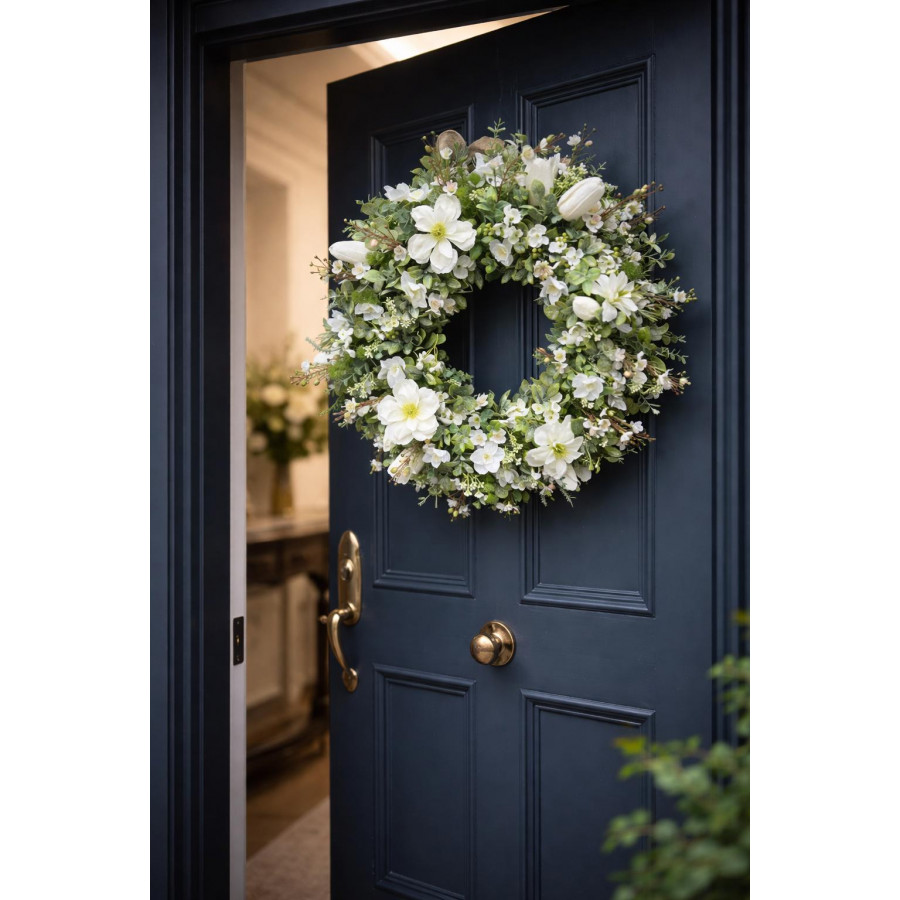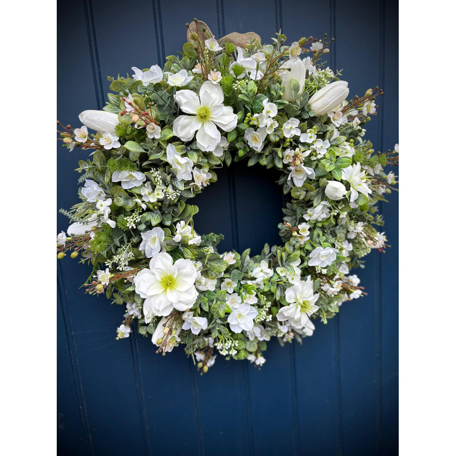 This handmade luxury Spring wreath reflects the beauty of the season. The wreath is made with evergreen faux foilage giving depth and fullness and then decorated with the most beautiful daffodils, hydrangeas, blossom and other Spring flowers.